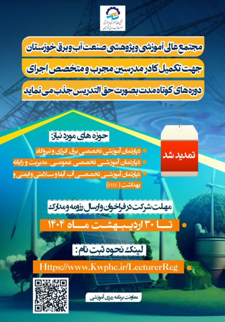 تمديد إعلان استقطاب المدرسين في المجمع العالي للتعليم والبحوث لصناعة المياه والكهرباء في خوزستان لعام ١٤٠٤ هـ.ش